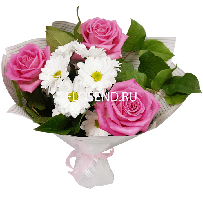 Букет «3 розовых роз и 2 белых хризантем» в Кудрово
