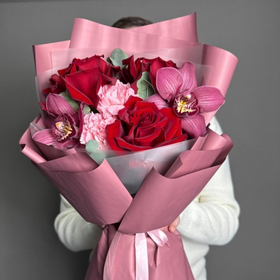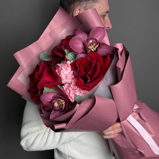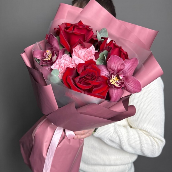 Букет из 3 красных роз, орхидей и диантуса в Кудрово